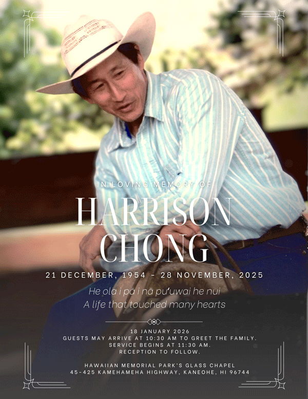 The late Fire Captain Chong passed away on November 28, 2025. He was appointed to the Honolulu Fire Department (HFD) on November 18, 1974, and served 28 years. His last assignment was with Engine 15, 1st Platoon.