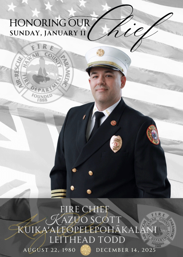 Fire Captain Kahakua passed away on January 15, 2025. He served the department for 25 years until his retirement in 2015, with his last assignment being at the North Kohala Fire Station. A Celebration of Life was held at Kahaluʻu Ma Kai (former grounds of Keauhou Beach Hotel and Kona Lagoon, south of Kahaluʻu Beach Park) on Saturday, February 15, at 1030.
